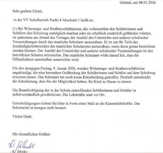 Bitte beachten Sie das Schreiben der Schulleiterin vom 8. Januar 2026: