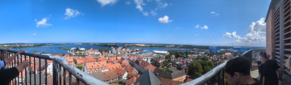 Bild oben: Blick von der St.-Petri-Kirche Wolgast, Panorama in 50m Höhe, Blick nach Usedom