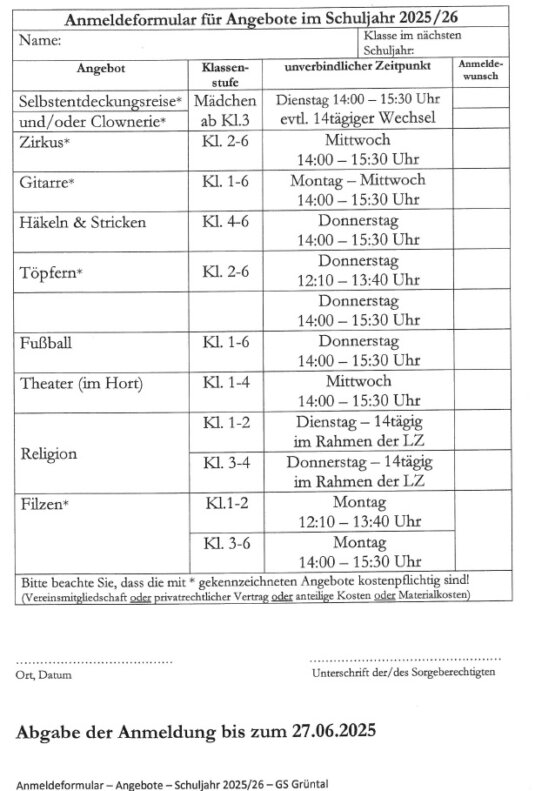 leider wird es auch im neuen Schuljahr nur eine unzureichende Anzahl von Angeboten geben. Mit dieser Situation sind auch wir sehr unzufrieden. Zum einen stehen uns vom Bildungsministerium für Ganztag kaum Lehrerstunden zur Verfügung und zum anderen finden auch nur wenige externe Anbieter den Weg zu uns. Deshalb haben wir den Markt der (begrenzten) Möglichkeiten in diesem Jahr in „Schulhoffest“ umbenannt. Er findet am 19.06.2025 von 16:00 – 18:00 Uhr auf unserem Schulgelände statt. Hier werden die wenigen Anbieter ihr Angebot vorstellen, welche entweder während der Lernzeit oder im vierten Lernblock von 14:00 – 15:30 Uhr stattfinden. Auf einem Anmeldebogen können Sie dann ein Angebot (alternativ ein zweites) für Ihr Kind auswählen und bis spätestens 27.06.2025 beim Klassenleiter abgegeben. Entsprechend der bis zu diesem Termin vorliegenden Rückmeldungen, werden wir eine Einteilung vornehmen.