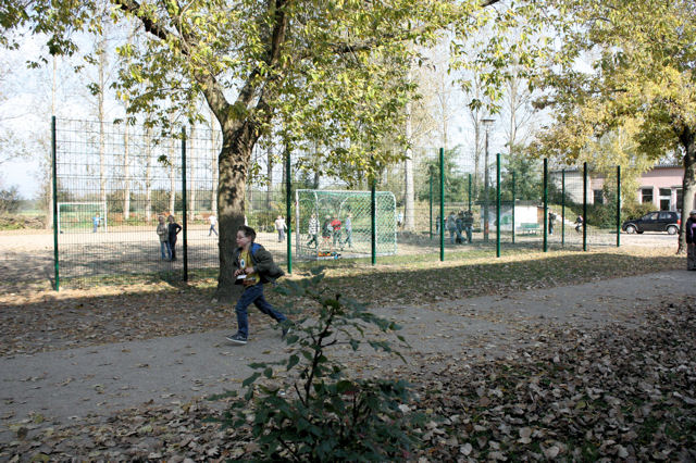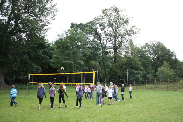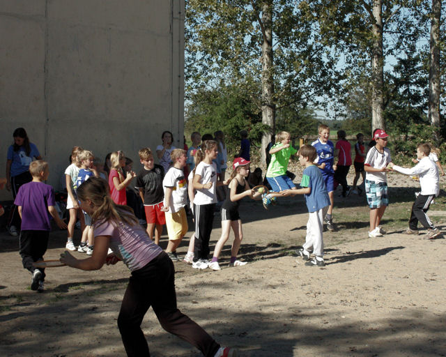 Schulgelände bei gemeinsamen Abendbrot, Sportspielen und Diskothek