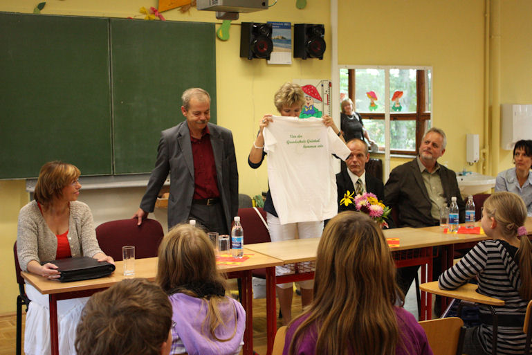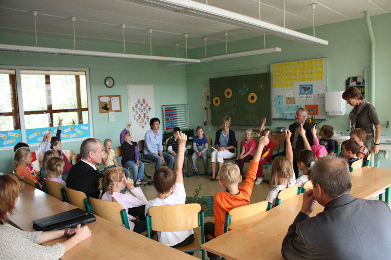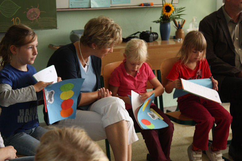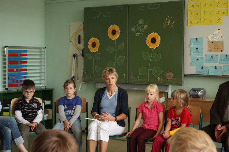 die Einschüler vor und begrüßte die anderen 179 Schüler und 17 Lehrer und 3 Erzieher aus den Ferien zurück. Und dann gab es einen Vorausblick: Als Schule haben wir natürlich vor allem unseren Unterrichtsauftrag zu erfüllen: Die erstaunliche Zahl von 16.000 Unterrichtsstunden wird wohl im Laufe des kommenden Schuljahres wieder zusammenkommen. Außerdem werden wir mit den einzelnen Jahrgangsstufen Exkursionen unternehmen und zu verschiedenen Themen Projekte durchführen, Sportfeste gestalten, uns mit unserer Partnerschule aus Nowy Tomysl treffen, ein Kulturfest erleben, ein Kinderfest feiern und für einige Klassen gibt es auch eine Klassenfahrt. Typisch ist für unsere Schule ja auch die gute Zusammenarbeit zwischen Schule und Hort, sowie den vielen Anbietern von Angeboten innerhalb unserer Verlässlichen Halbtagsgrundschule und die Unterstützung, die wir durch unseren Schulträger, die Gemeinde Sydower Fließ, erfahren. Das soll nicht heißen, dass es nicht auch dort Reserven gibt, die wir erschließen wollen. Wir wollen vor allem um die Unterstützung durch die anderen Gemeinden werben. Neben den Einschülern stehen traditionell die Sechstklässler im Mittelpunkt. Sie bereiten sich auf den Übergang zur Klasse 7 vor. Für alle Schüler, Lehrer und Eltern gilt aber: Wir wünschen ein Schuljahr voller Neugierde und Wissensdurst, Anstrengungsbereitschaft, Gesundheit und Erfolg beim Lernen! Die Märkische Oderzeitung (www.moz.de) fotografierte die Einschüler und veröffentlichte die Fotos (nach entsprechender Zustimmung durch die Eltern) in der Papierausgabe und in der Online-Ausgabe - hier geht's zur Galerie u.a. mit den Fotos unserer drei Klassen. |