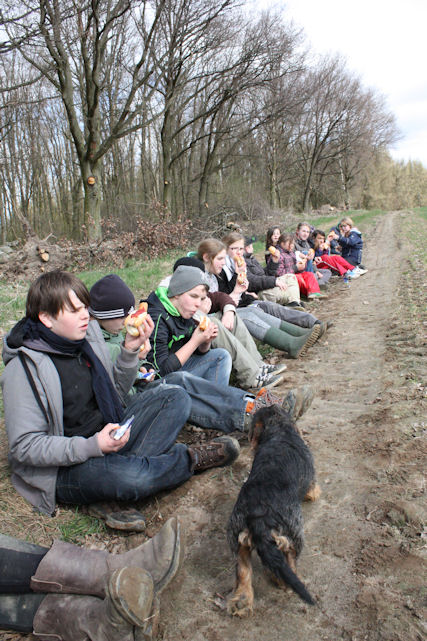 Schülergruppen auf einem Autobahnrastplatz um von dort mit den