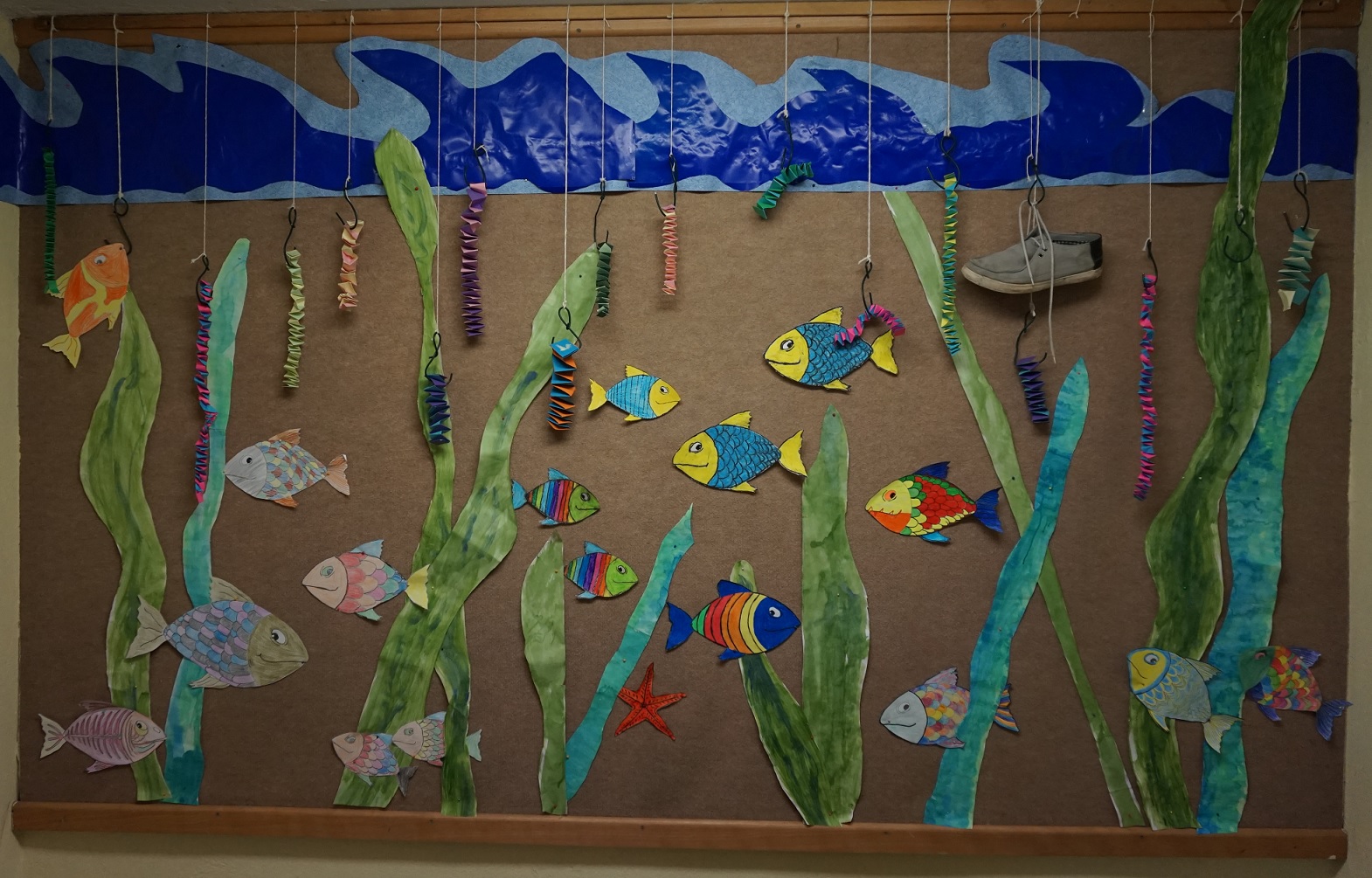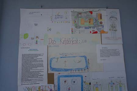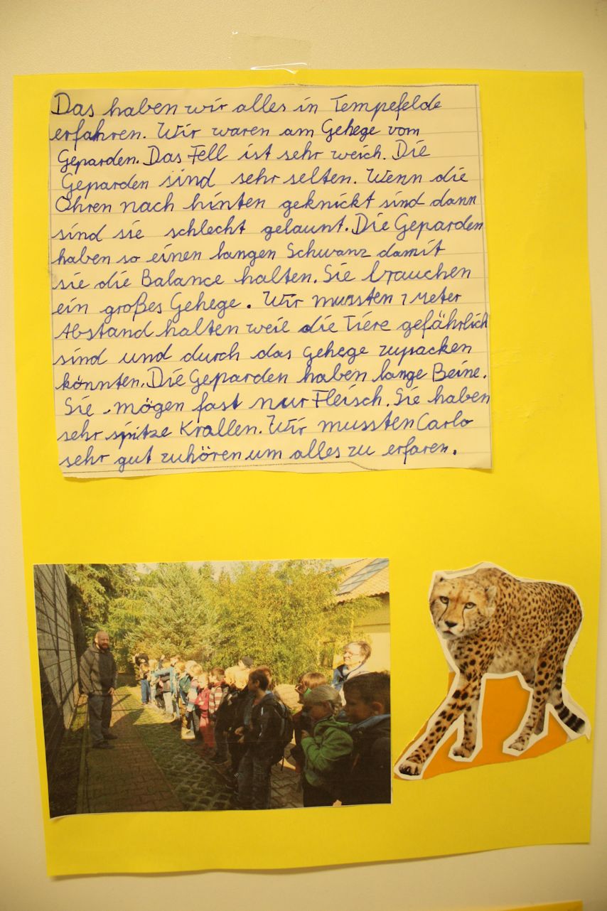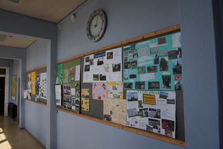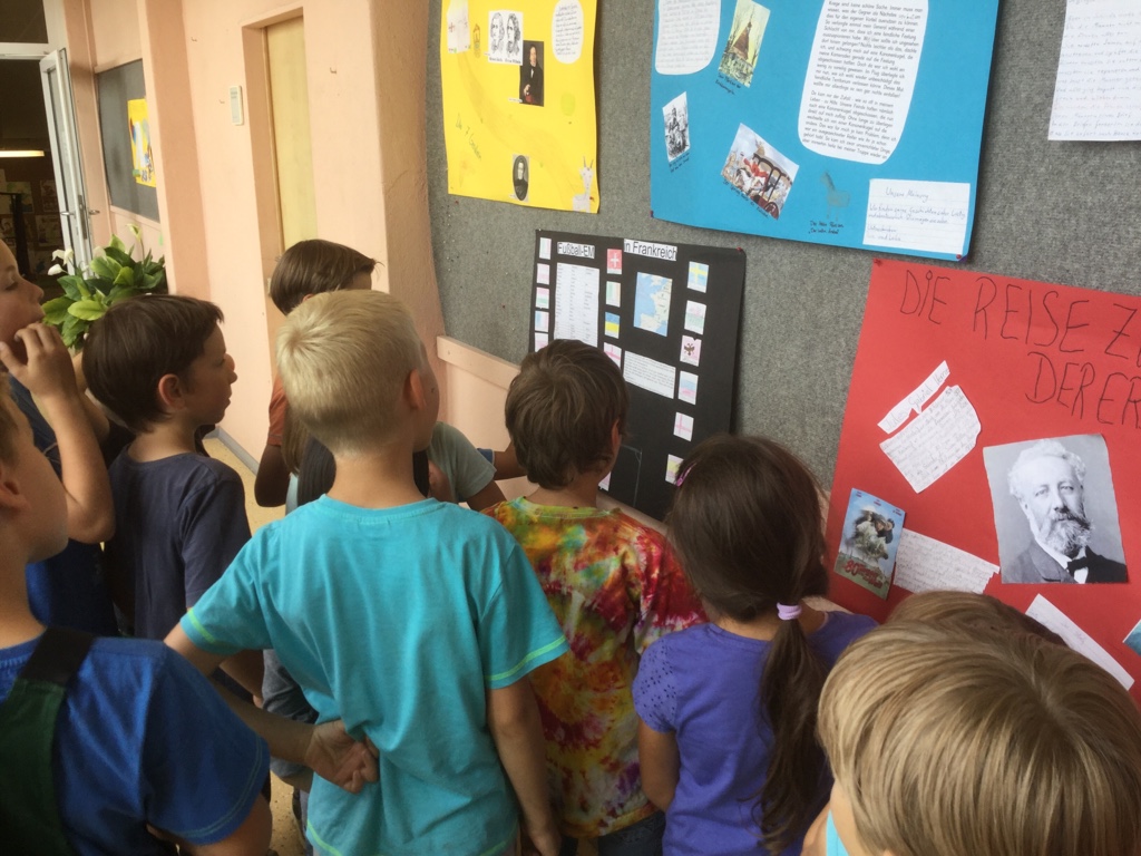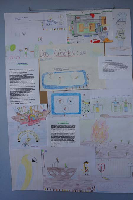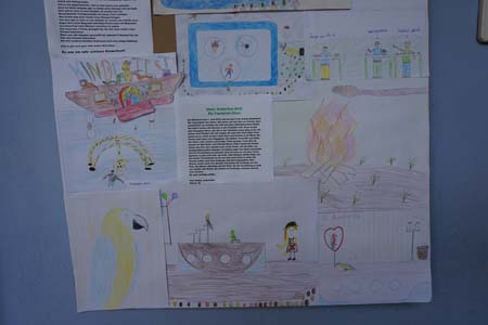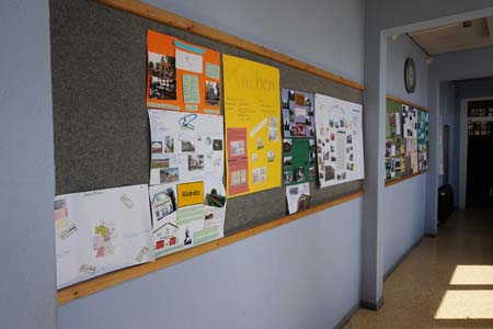 Hier ein kurzer Blick auf den Flur in der ersten Etage: Dritt- und Viertklässler präsentieren ihre Arbeiten zum Heimatort (Sachunterricht) und als Rückblick auf das Kinderfest (Deutsch).