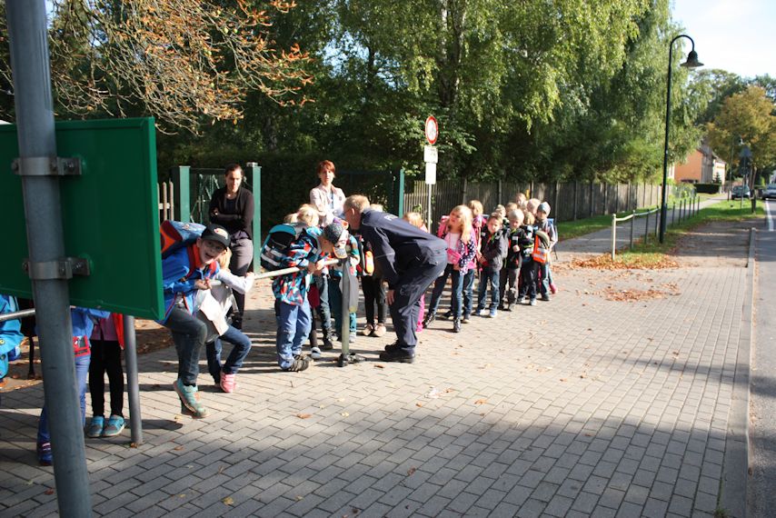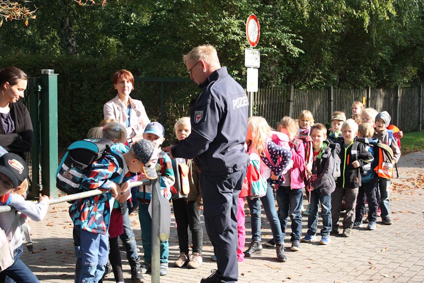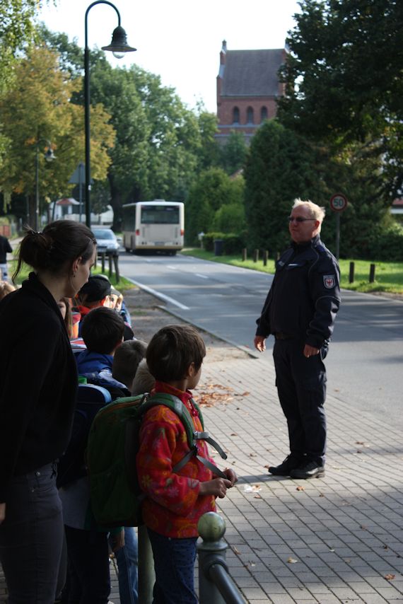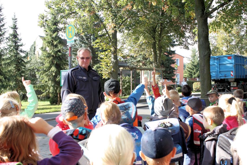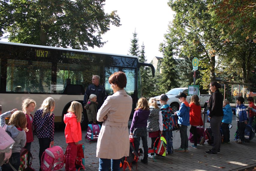 Im Landkreis Barnim gibt es eine gemeinsame Initiative der Polizei, der Verkehrswacht und der Busgesellschaften, die es Schulen ermöglicht, mit den Erstklässlern an einem Vormittag das Warten und Anstellen an der Bushaltestelle, das umsichtige Ein- und Aussteigen und das richtige Verhalten im Bus zu üben. Das ist keine Kleinigkeit und gelang in diesem Jahr durch die freundliche Anleitung durch Herrn Polizeimeister Alexander Jasiczek, der mit Geduld und Genauigkeit die Schüler belehrte und mit ihnen übte. Vielen Dank an die Initiative. |