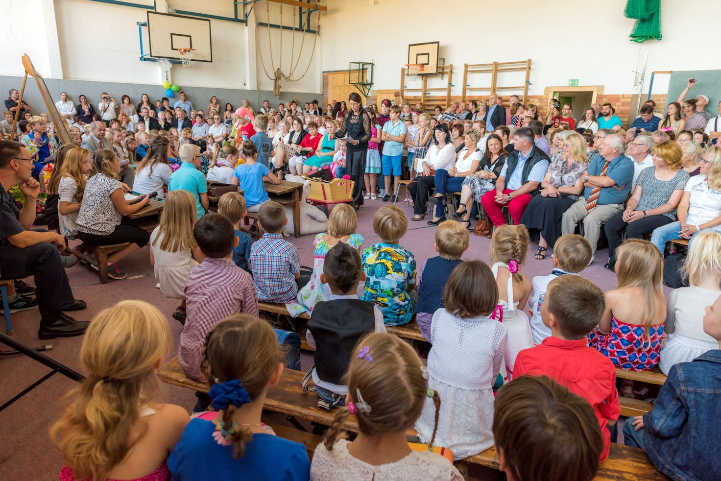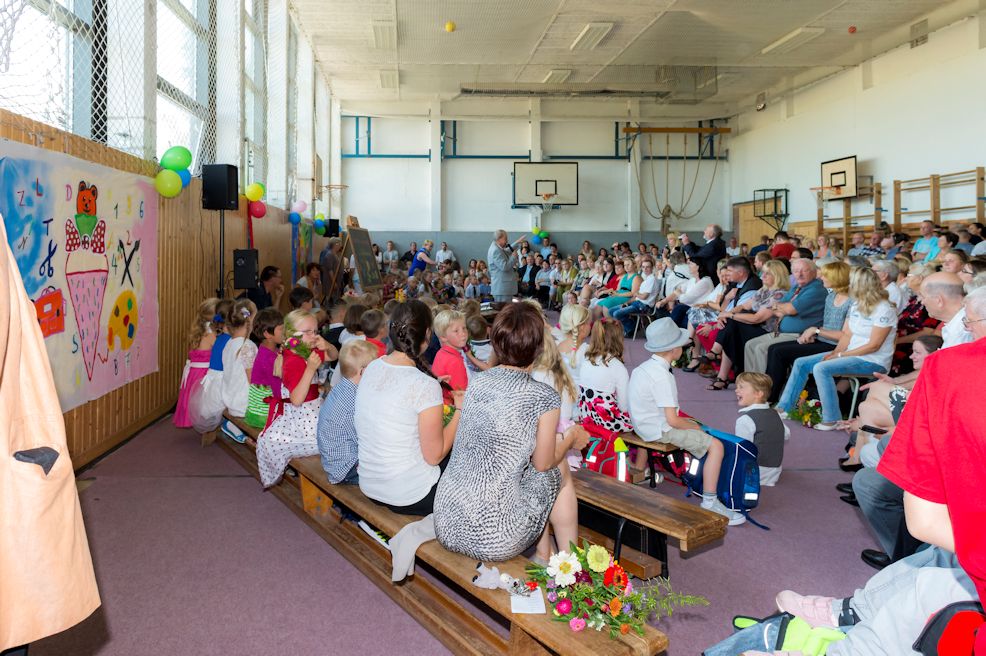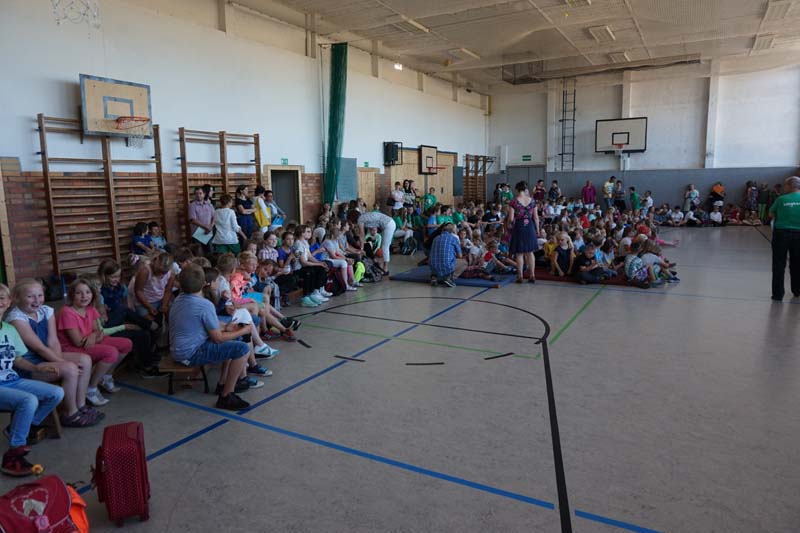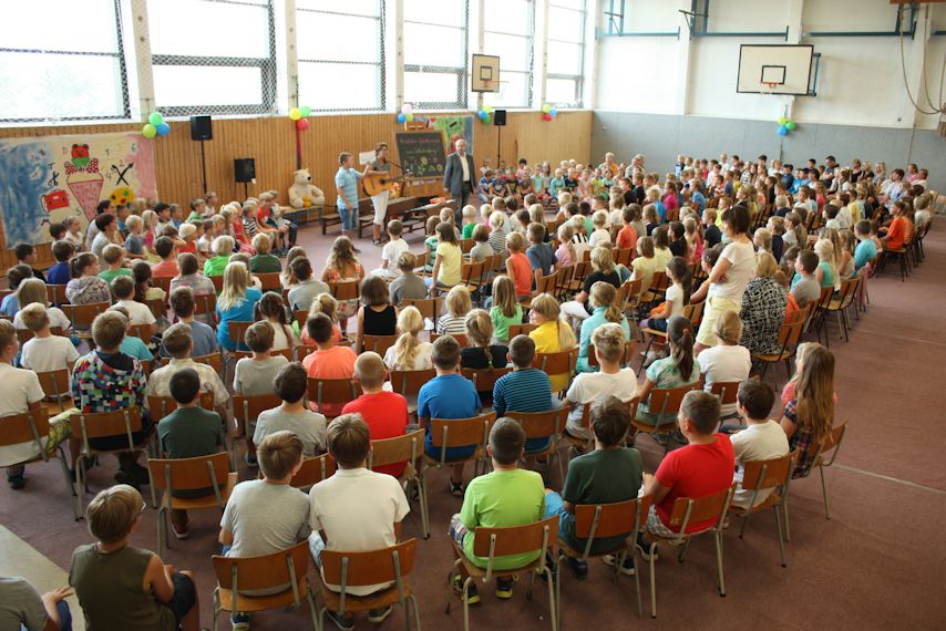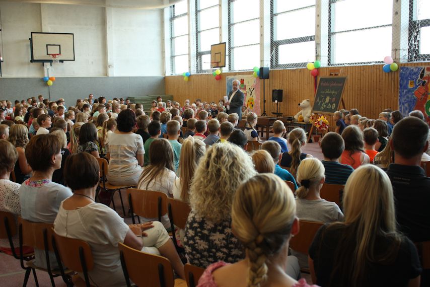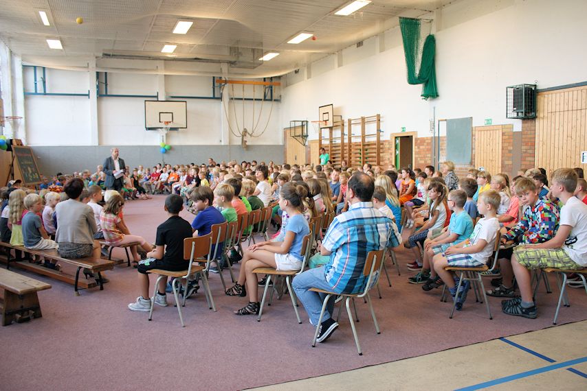 Nach sechs Wochen Ferien hieß es für die Schüler heute wieder: Pünktlich aufstehen und ab zum Bus, auf das Fahrrad oder zu Fuß den Weg zur Schule finden. Zum Glück war man dabei nicht allein! Und zu erzählen hatten die meisten von interessanten Ferienerlebnissen. Nach einer kurzen Begrüßung im Klassenraum ging es mit der Klassenlehrerin oder dem Klassenlehrer in die Turnhalle zur Schülervollversammlung. Eine neue Klassenlehrerin/ -lehrer bekamen die neugebildeten dritten Klassen (Frau Dreßler, Frau Behrend), die Klasse 4b (Frau Greuel), sowie die Klassen 5a (Herr Behrend) und 5b (Herr Karl) und natürlich die 52 Einschüler, die nun mit den Zweitklässlern ihrer Flex-Klasse und ihrer Lehrerin/ ihrem Lehrer auf die anderen Schüler trafen. Mit insgesamt 238 Schülern war die Turnhalle gut gefüllt. Herr Blanck begrüßte alle neuen Schüler, auch die Zugezogenen, gab einen Überblick auf das neue Schuljahr. Begrüßt wurde auch Herr Mainusch, der als Klassenlehrer der Flex C unser Lehrerteam verstärkt und die drei neuen Erzieherinnen, die das Hortteam bei seiner sehr erfolgreichen Arbeit unterstützen werden. Das gemeinsame Singen der Schulhymne beendete die halbe Stunde von 8.00-8.30 Uhr. Dann ging es in Klassenräume und bis zum Ende des zweiten Lernblocks (11.25 Uhr) gab es Klassenleiterstunden: Die Stundenpläne wurden bekannt gegeben, die Belehrungen erfolgten, die Veränderungen im Schulhaus (Stichwort: Fußbodensanierung) und auf dem Schulhof wurden in Augenschein genommen und nach der Mittagspause gab es dann schon Unterricht nach Plan... Die sechste Klasse räumte die Turnhalle aus, so dass auch der Sport in der Turnhalle beginnen kann.