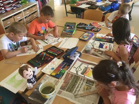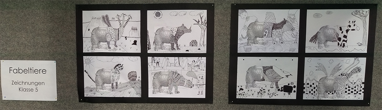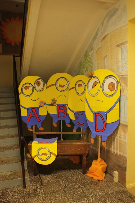 ![]() Im Flur der Schule grüßen bekannte Gesellen. Dieser Eingangsbereich wurde von Herrn Possin und den Kindern des Ferienhortes gestaltet. Mehr zum Hort? Links und rechts davon ein Blick in den LSD (Lesen-Schreiben-Drucken)-Raum, darunter, von links nach rechts: Klassenraum der Flex C (Klassenlehrer Herr Mainusch), ein Detail aus der Turnhalle, Klassenraum der Flex A (Klassenlehrerin Frau Harz). Mehr zur Klassenlehrerstatistik: Unser Organigramm - Wer ist für wofür verantwortlich? |