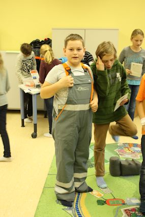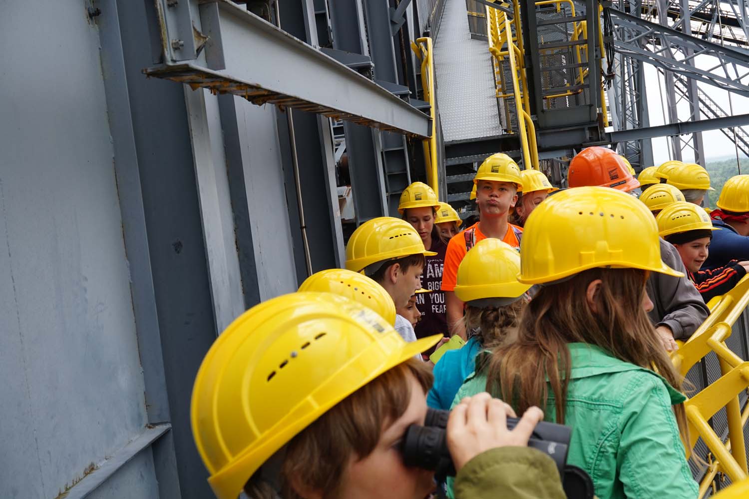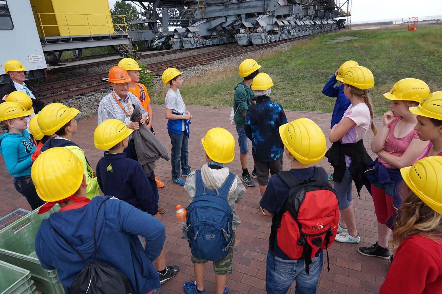 Lea schreibt:"Am meisten gefiel mir die F60 Abraumförderbrücke. Als wir ankamen wurden wir in drei Gruppen aufgeteilt. Nach und nach gingen die einzelnen Gruppen zur F60. Am Helmwagen bekam wir alle einen Schutzhelm und begannen den Aufstieg. Zuerst ging es nur ein paar Stufen hoch und oft blieben wir für Erklärungen stehen. Z.B. die F60 ist 502m lang und besteht aus 11000 t Stahl. Dann ging es überwiegend über schräge Laufgänge weiter hinauf. An der Seite waren kleine Schilder angebracht, die die Höhe angeben. Ganz oben angekommen schwebten wir 74m über dem Boden! Der Ausblick war wunderschön! Zu erkennen war ein See, der Bergheider See, der das Tagebaurestloch füllt, ein Wald und eine Stadt. Der Rückweg ging sehr schnell. Als wir unten angekommen waren, brachten wir unsere Helme weg und gingen zu den Bussen. Weiter ging es nun zum aktiven Tagebau Welzow Süd. Dort sahen wir eine F60 in Aktion. Im riesigen Tagebau sah diese Riesenmaschine wie Spielzeug aus..."