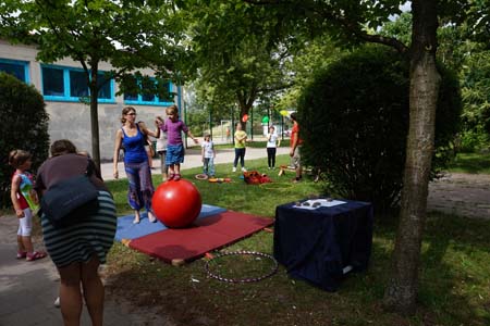 Traditionell zum Ende des Schujahres richten wir auf dem Schulhof, in der Turnhalle, in der Schülerwerkstatt und in der Schule in der Zeit von 16. - 18.00 Uhr den "Marktplatz der Möglichkeiten" aus: Dabei bieten wir allen Anbietern unserer Ganztagsangebote die Möglichkeit, Ihre Arbeitsgemeinschaft vorzustellen und erste Mitmachmöglichkeiten anzbieten, die dann Lust auf Mehr bereiten. Für die richtige Marktatmosphäre sorgt ein DJ, der als ruhiger "Marktschreier" von Stand zu Stand geht und in Kurzinterviews zusätzliche Informationen entlockt. Das Marktpublikum bilden die neugierigen Schülerinnen und Schüler und deren Eltern und Großeltern. Für die kleine Stärkung zwischendurch sorgt der Förderverein unserer Schule mit einem Grillstand und einer Getränkeversorgung. Dieses "Mehr" beginnt dann in der zweiten Schulwoche des neuen Schuljahres: In der Regel einmal in der Woche finden diese Angebote ihren Platz im Rahmen des Ganztagsbetriebes entweder im dritten (ab 12.15 Uhr ) oder vierten (ab 14.00 Uhr) Lernblock. Und je nachdem, wofür man sich entschieden hat, heißen dann diese "Angebotsfächer": Zirkusakrobatik, Tischtennis, Instrumentalunterricht, Judo, Naturwacht, Laborkids, Badminton, Kleiner Feuerwehrmann, Computermäuse, Lego Education, Tanzmäuse, Waldforscher, Pop- und Showtanz... Das sind noch immer nicht alle! Mit dem Übersichtsblatt der in Frage kommenden Angebote - in drei verschiedenen Farben, weil nach Jahrgangsstufen 1/2, 3/4 und 5/6 unterschieden, schlenderte man also über den Marktplatz, setzte Kreuze, unterschrieb und gab das Blatt als Anmeldeantrag für die AG ab. Nicht so schnell Entschlossene haben noch bis zum 6. Juli Zeit, den Anmeldebogen im Sekretariat abzugeben. Auf dem Schulgelände konnten wir ja auch wieder viele zukünftige Schüler, die sich also für ihren Schulstart auch schon eine AG aussuchen konnten. Die Einschülereltern trafen sich im Anschluss an das Marktgeschehen in dem Mensa der Schule und hielten dort eine Elternversammlung ab. Ebenso trafen sich die Eltern der künftigen Fünftklässler: Da es viel Neues gibt - Fächer und Lehrer - gab es hier auch eine Infromationsveranstaltung.