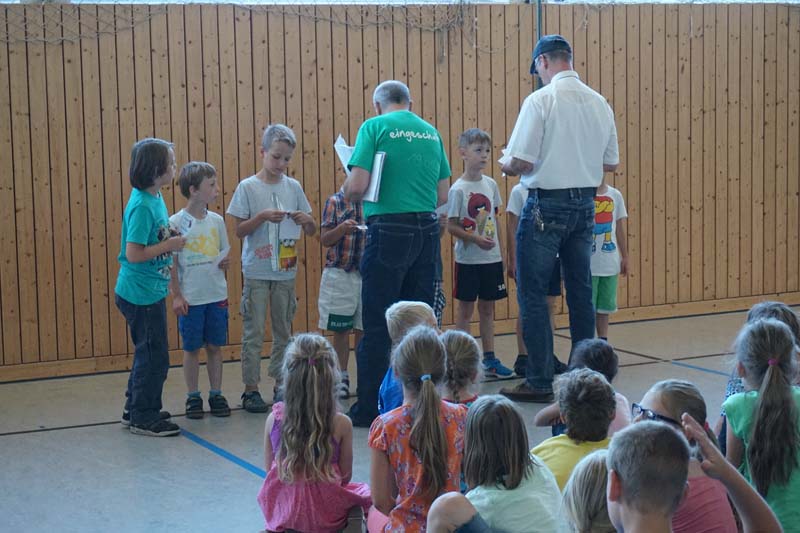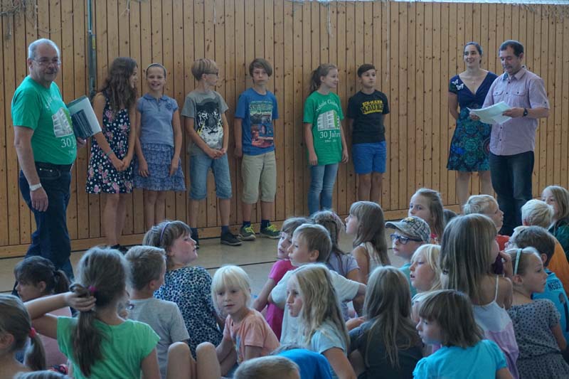 Oben: 238 Schüler, alle Lehrer und viele Eltern und Großeltern haben sich in der Turnhalle versammelt zur Schülervollversammlung und lassen gemeinsam mit Herrn Blanck das Schuljahr Revue passieren... |