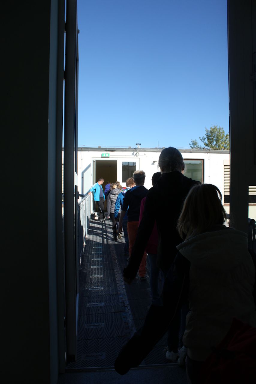![]() Oben: Alle Klassen trafen ruhig und zügig auf dem Stellplatz ein. Links und rechts: Oben. Alle Klassen trainierten den Evakuierungsweg über das Dach - dabei wurde natürlich darauf geachtet, dass die jeweilige Klasse aus genau der Richtung kam, in der auch ihr Klassenraum liegt. |