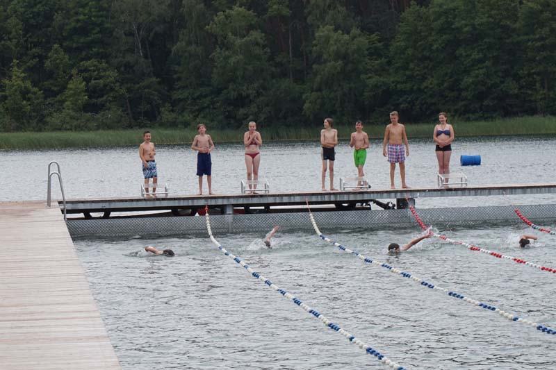 Bei nicht idealen Bedingungen betätigte sich heute die Schule sportlich: Die Jahrgangsstufen 1 bis 3 auf dem Sportplatz in Grüntal und die Jahrgangsstufen 4 bis 6 am Wukensee beim Schwimmsportfest. Nach dem 50m-Zeitschwimmen wurden die besten Streckentaucher gesucht. Zum Abschluss gab es den Staffelwettbewerb. Je acht Schüler pro Klasse traten gegeneinander an. |