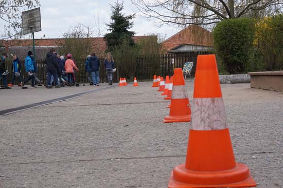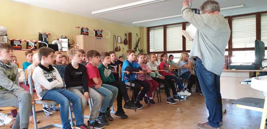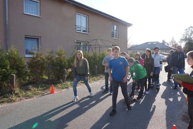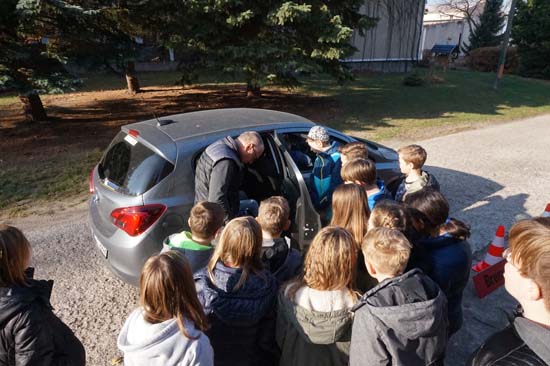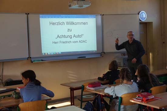 Am Mittwoch, den 7. November besuchte uns als Experte Herr Friedrich vom Automobilclub ADAC. Er arbeitet als Fachreferent in Schulen und Kindergärten zum Thema "Verkehrssicherheit". Er besuchte die fünften und secchsten und vermittelte in Theorie und Praxis das Thema "Anhalteweg des Autos". So lernten wir, dass sich dieser zusammensetzt aus dem Weg der Schrecksekunde, dem Reaktionsweg und dem Bremsweg. Auf dem Schulhof überzeugten wir uns davon, dass allein der Bremsweg eines Autos bei Tempo 30 fünf Meter beträgt. Mit den beiden anderen Wegen summiert sich der Anhalteweg auf 13 Meter. Aber wehe: Wenn der Autofahrer abgelenkt ist, durch Rauschmittel sich der Reaktionsweg oder durch Schnee o.ä. der Bremsweg verlängert!