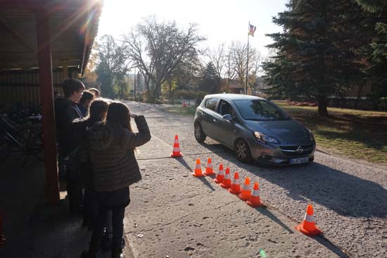 Außerdem erfuhren wir durch die Kurzmitfahrt im Auto, welche Kräfte auf den Körper wirken bei einer Vollbremsung: Zum Glück hielt uns der richtig angelegte Gurt und die Kopfstütze.