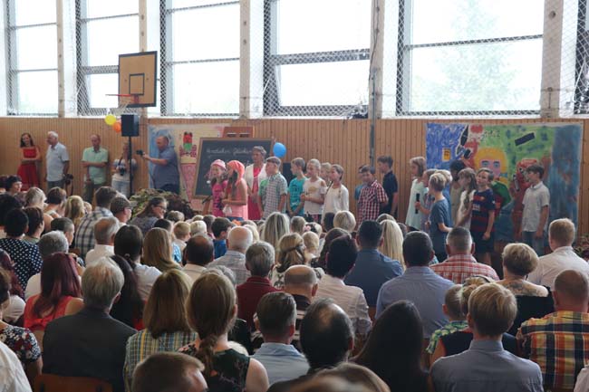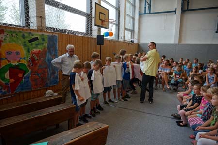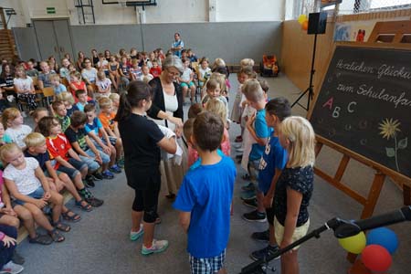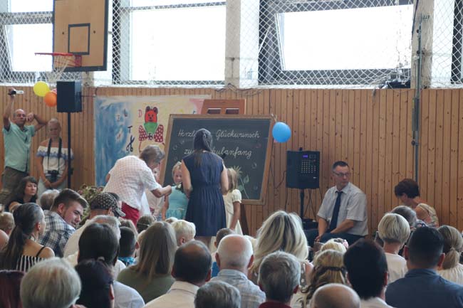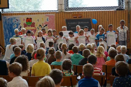 Pünktlich 10.00 Uhr in Grüntal. Die Dorfstraße straßenbegleitend zugeparkt. Aufgeregte künftige Schülerinnen und Schüler in Begleitung von Familie und Freunden haben in der Turnhalle Platz gefunden. Die kommissarische Schulleiterin Frau Villain begrüßt alle Anwesenden und gibt die kleineBühne frei für freundliche Viertklässler unserer Schule, die ein kleines Programm mit Spielszenen und Liedern rund um den Schulanfang präsentieren... Auftakt des neuen Schuljahres!