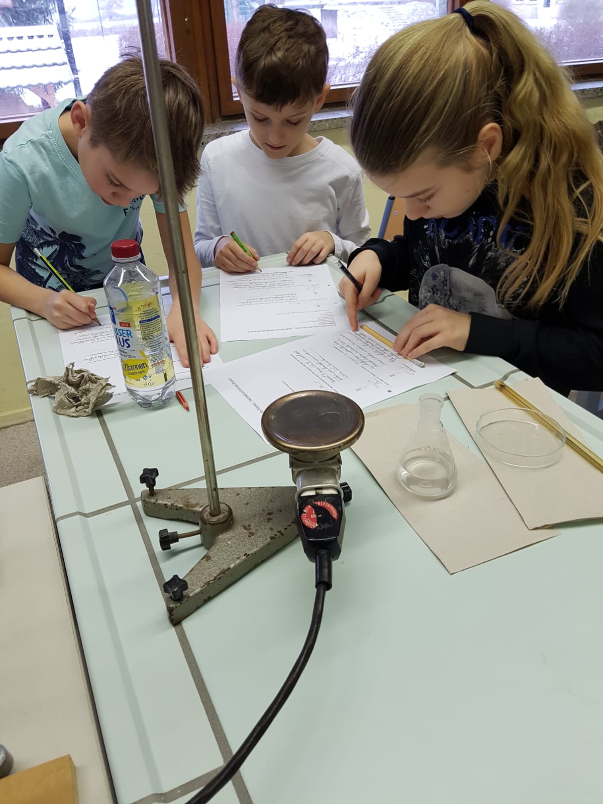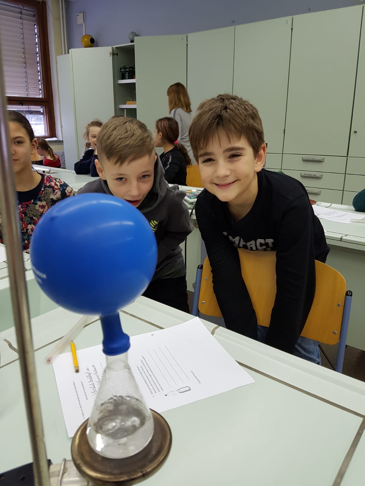 den Chemieraum besichtigen. Vor uns standen zwei Mädchen der älteren