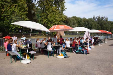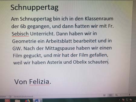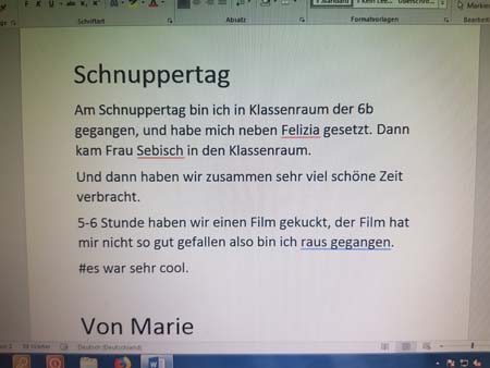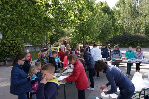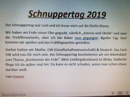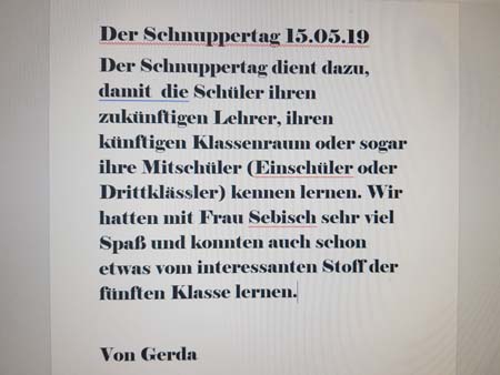 Schnuppertag. Künftige Schüler nehmen auf dem Schulhof einen kleinen Imbiss ein. Schnuppertag hieß es auch für die künftigen Drittklässler und die künftigen Fünftklässler: Von letzteren im Weiteren kurze Texte: |