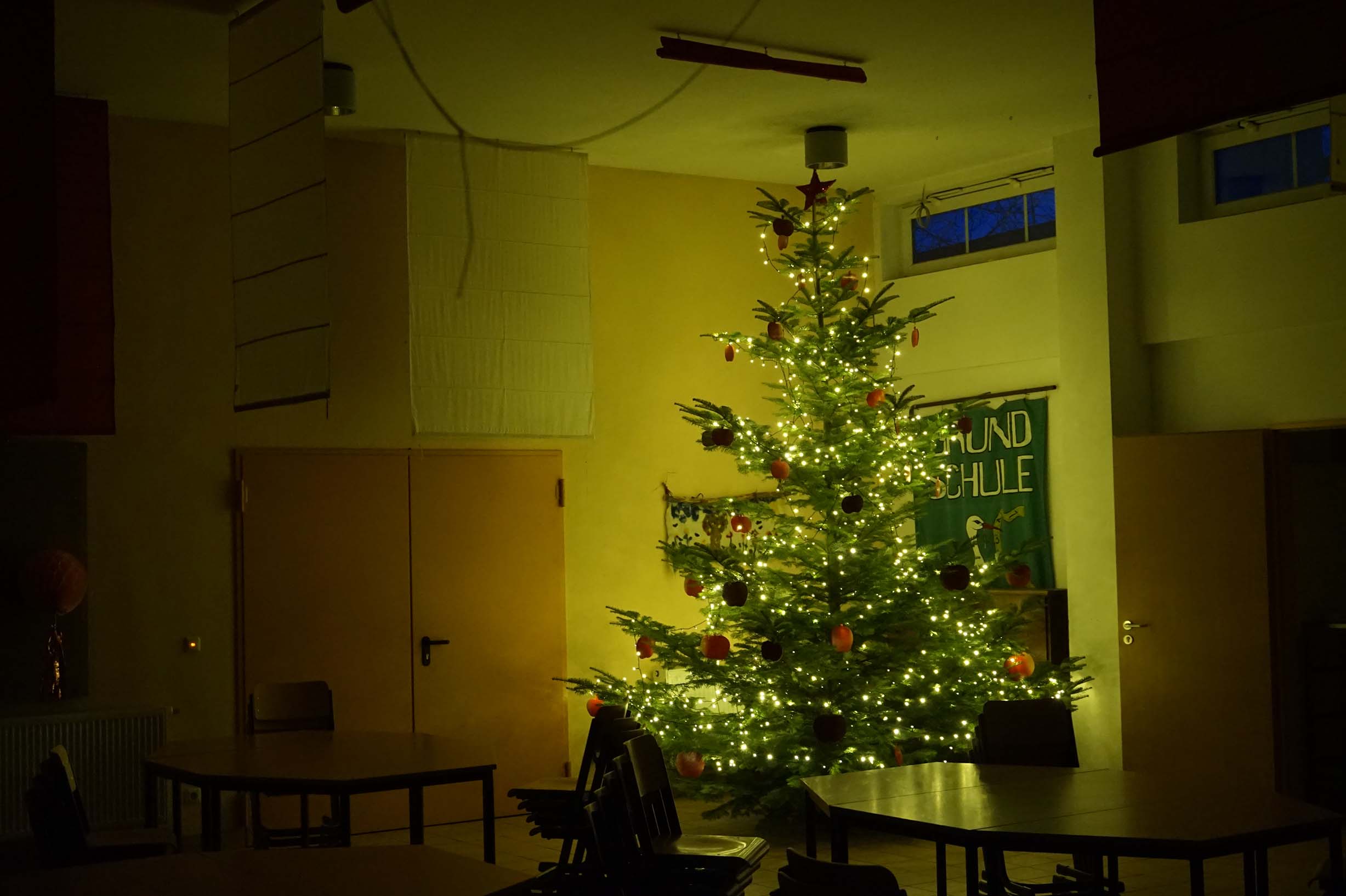 freundlich ins Auge... Wir haben zu danken! Vielen Dank an Herrn R.Schendel ("Mensa-Baum") und an die Gärtenerei Schubert ("Schul-Baum") und an die Herren Gresch und Weprajetzky für Anlieferung, Aufstellung und Schmückung... ![]() |